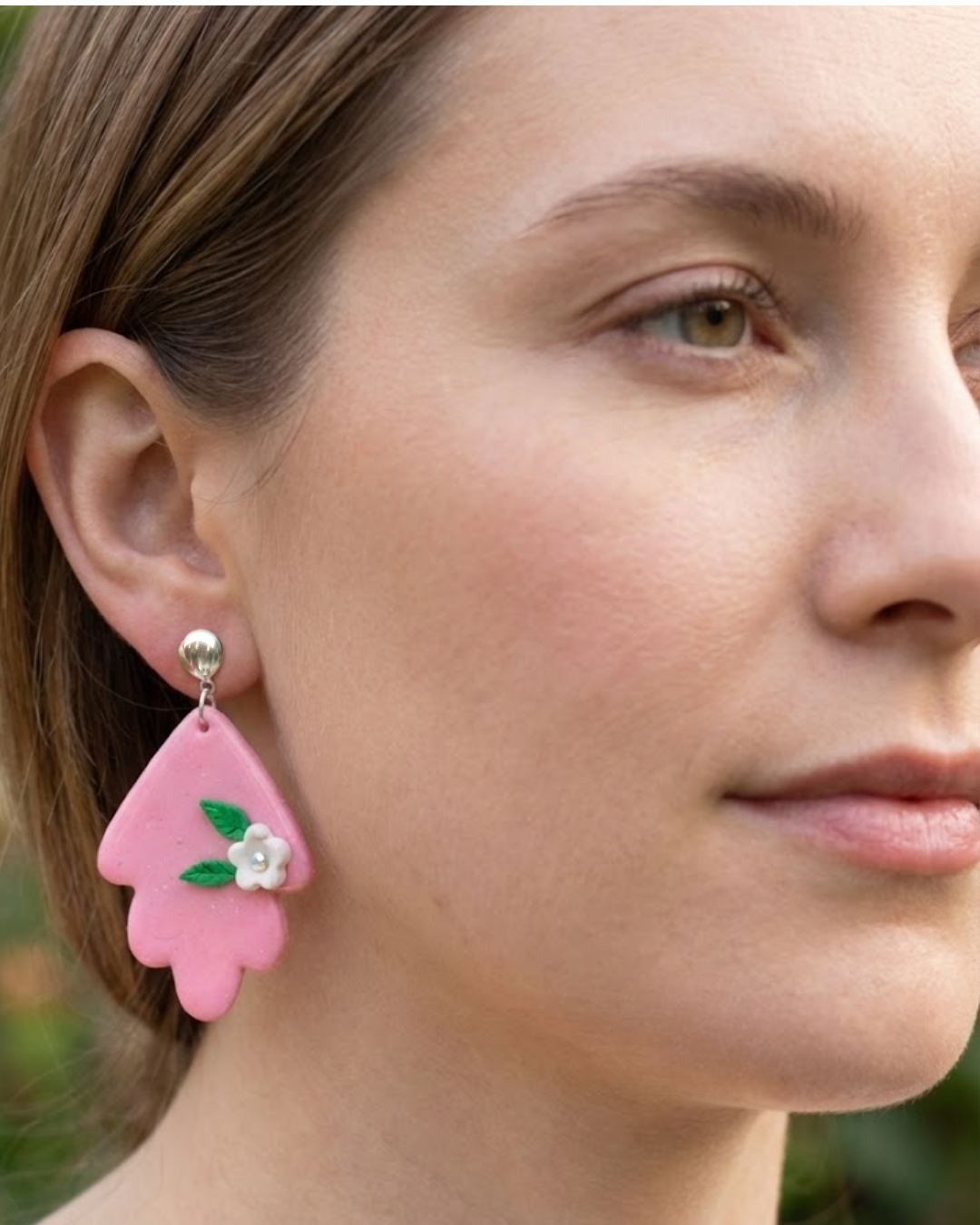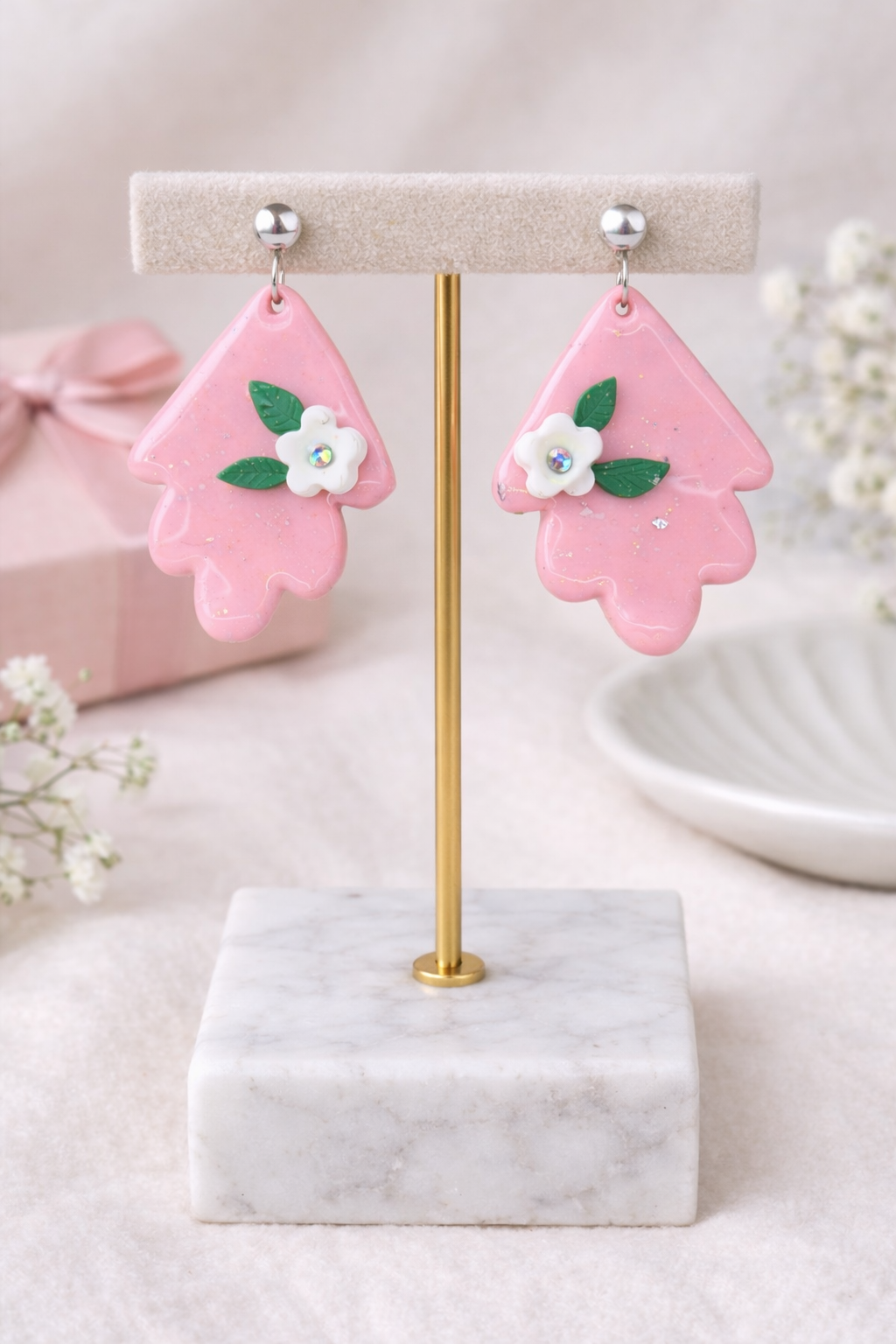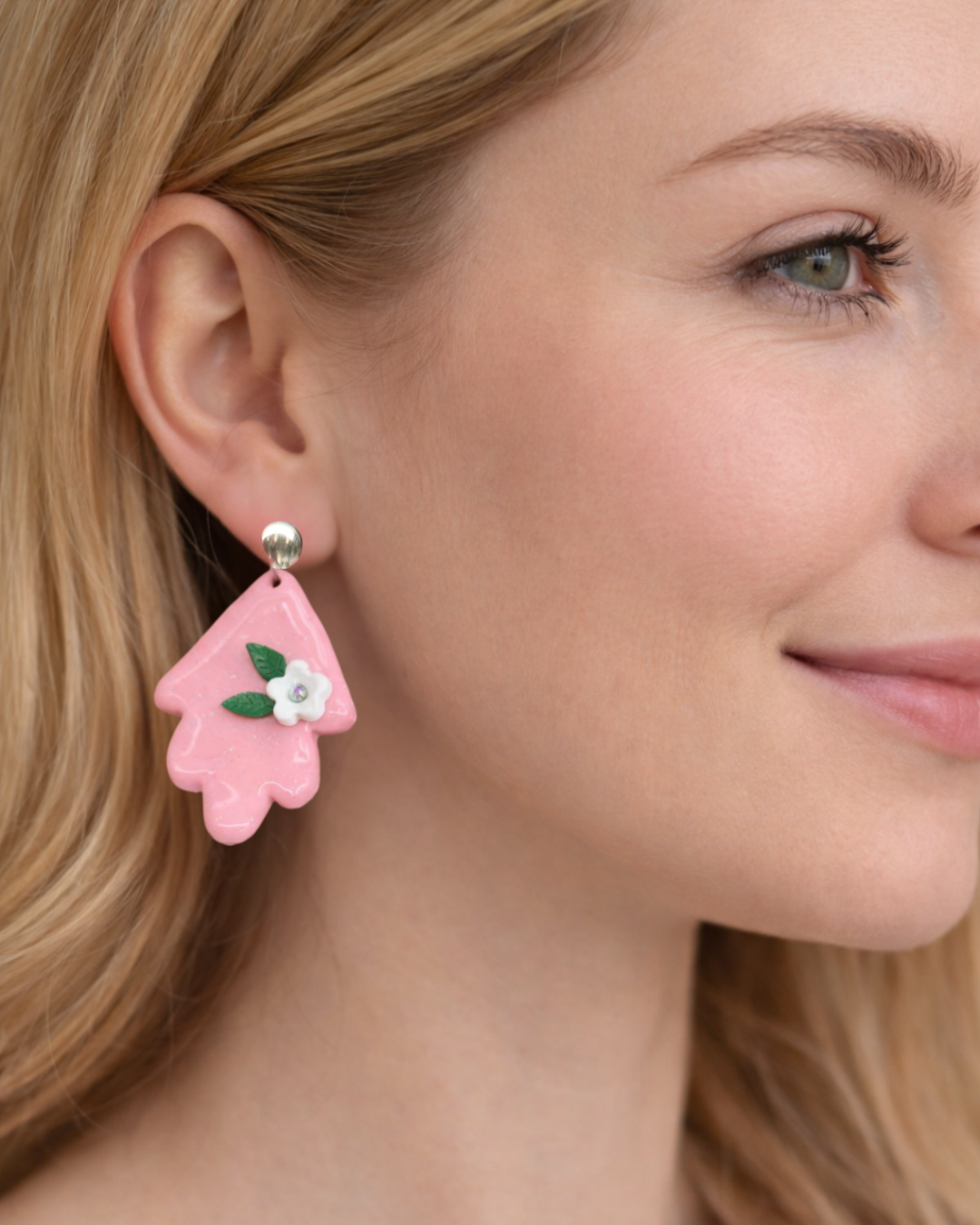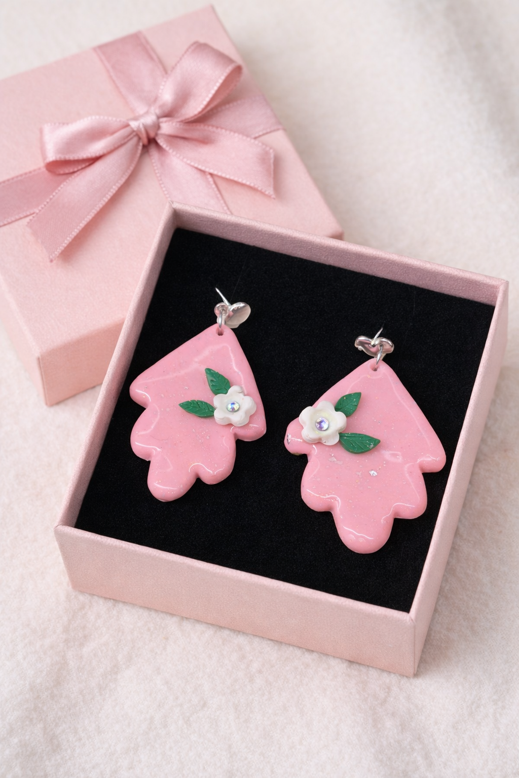 Ręcznie Robione Kolczyki „Wiosenny Ogród” – Różowe Listki z Kwiatuszkiem