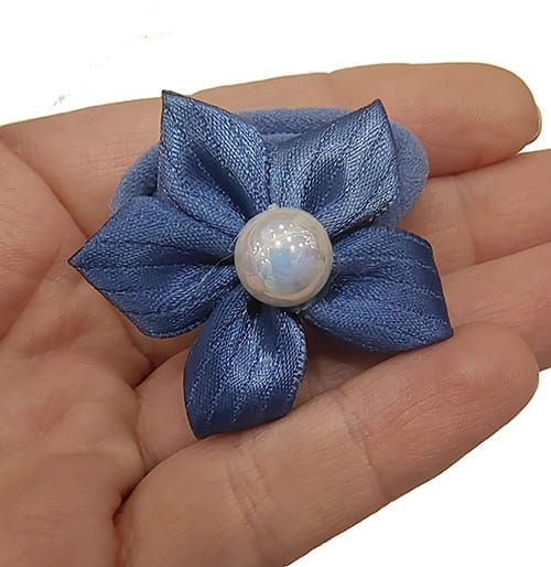 Ozdobiona kwiatuszkiem z tasiemki w kolorze niebieskim