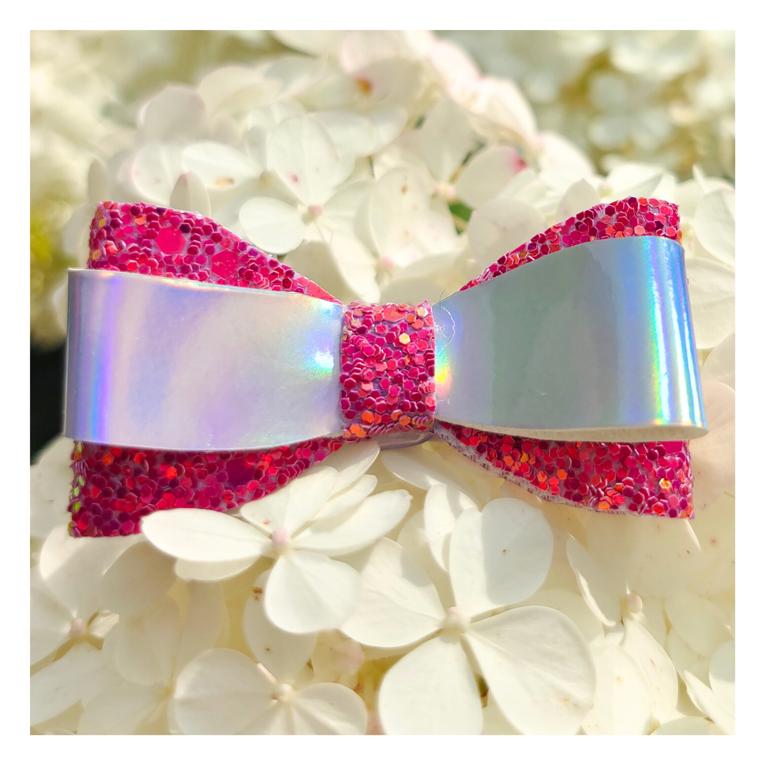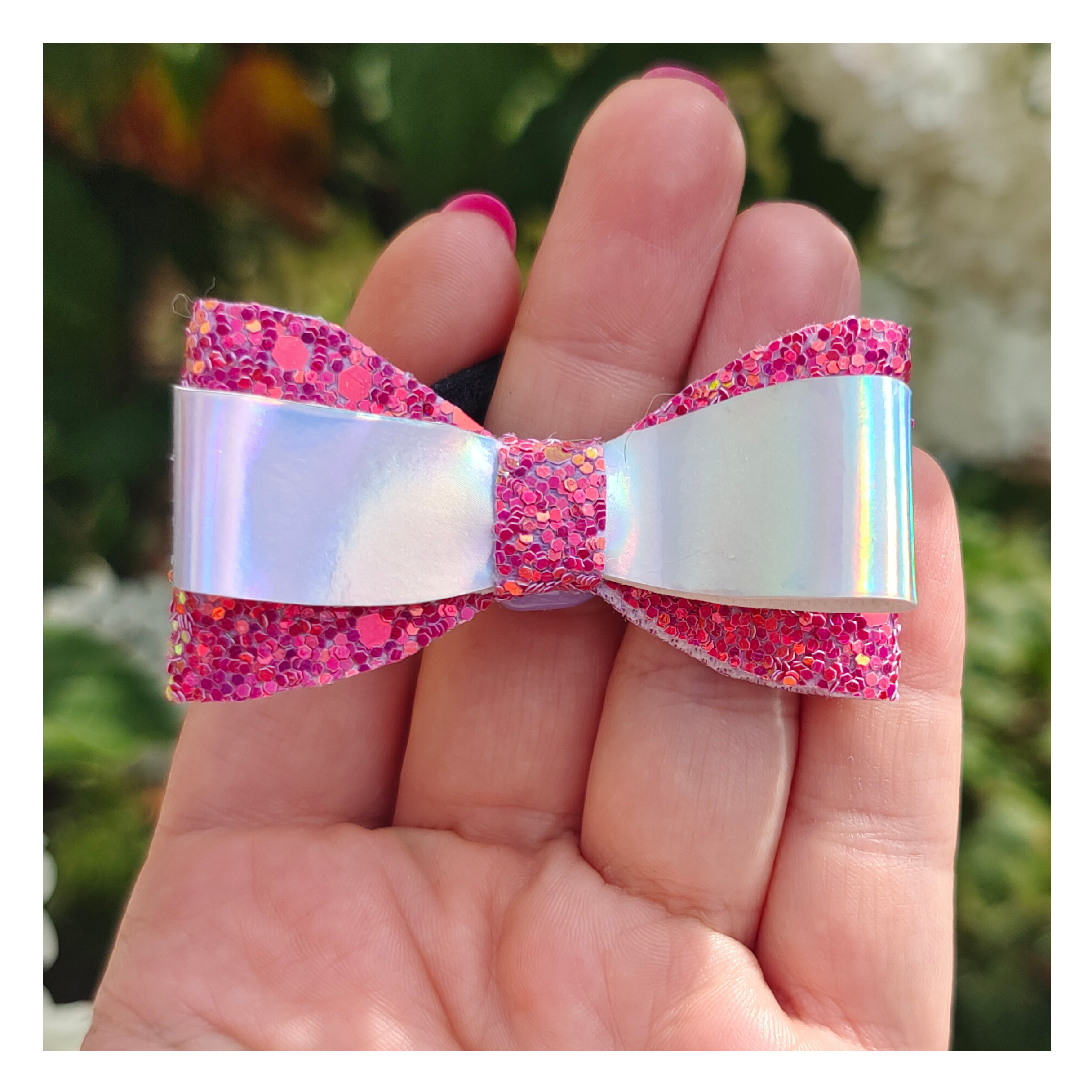 - Olśniewający design: Kokarda wykonana jest z błyszczących materiałów, które mienią się niczym drogocenne kamienie. Centrum kokardy to różowy, połyskujący materiał, a zewnętrzne części kokardy mienią się na biało-perłowo, dodając blasku każdej fryzurze.