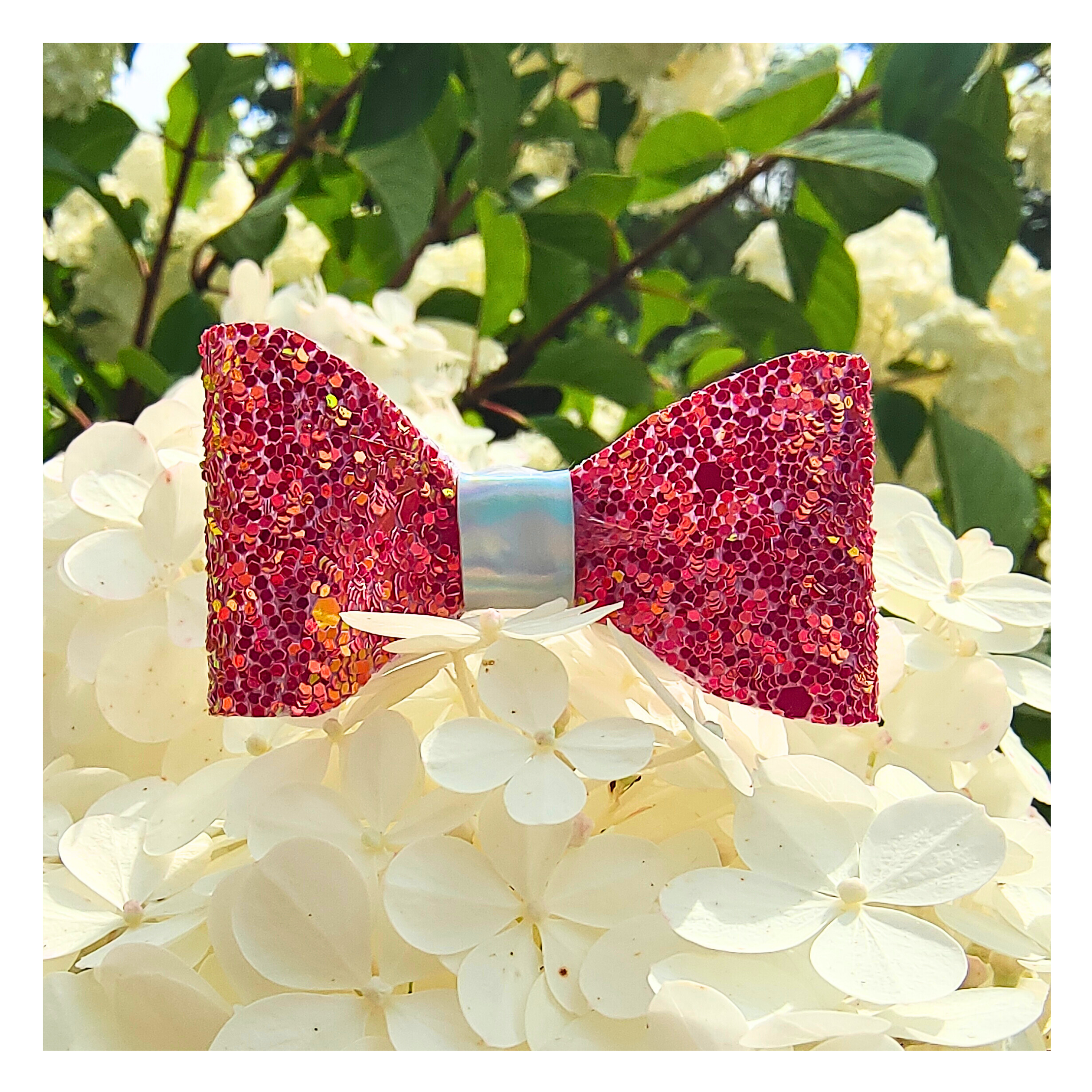 - Olśniewający design: Kokarda wykonana jest z różowego, połyskującego materiału pokrytego brokatem, który mieni się w słońcu, dodając blasku każdej fryzurze. Srebrny pasek po środku podkreśla wyjątkowy charakter gumki.