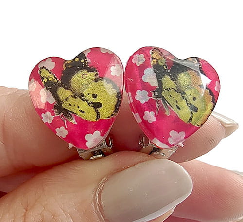 Klipsy motylki żółte na ciemno-różowym tle
