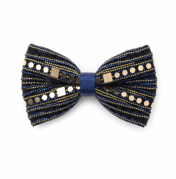 Efektowne Zdobienia: Głęboki granat materiału został przełamany pasami lśniących, naklejanych cekinów w odcieniach złota. To one sprawiają, że kokardka pięknie odbija światło i przyciąga wzrok.