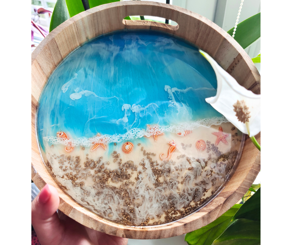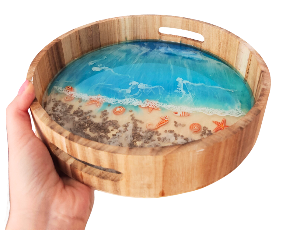 Piękna, okrągła drewniana taca z powłoką z żywicy epoksydowej.