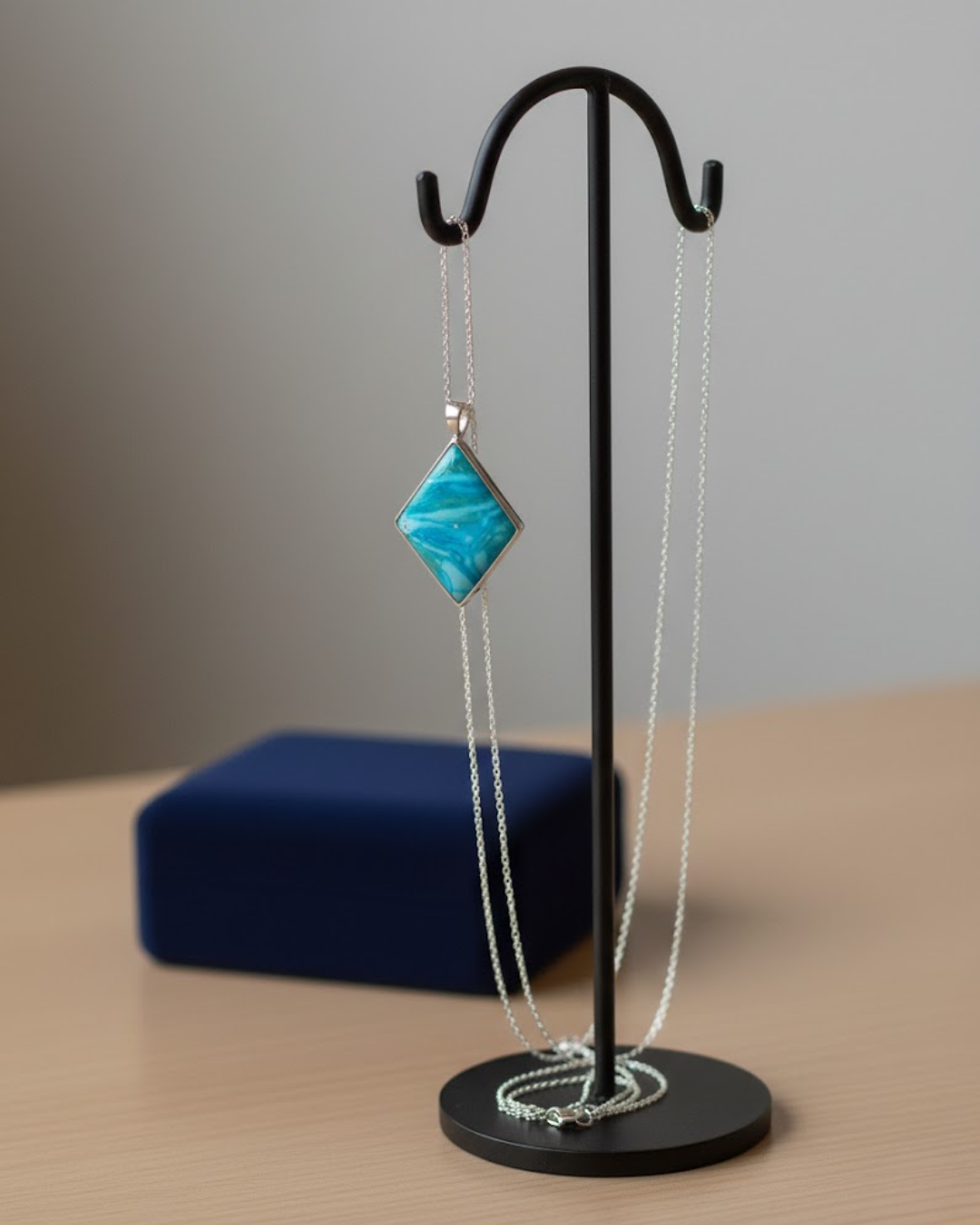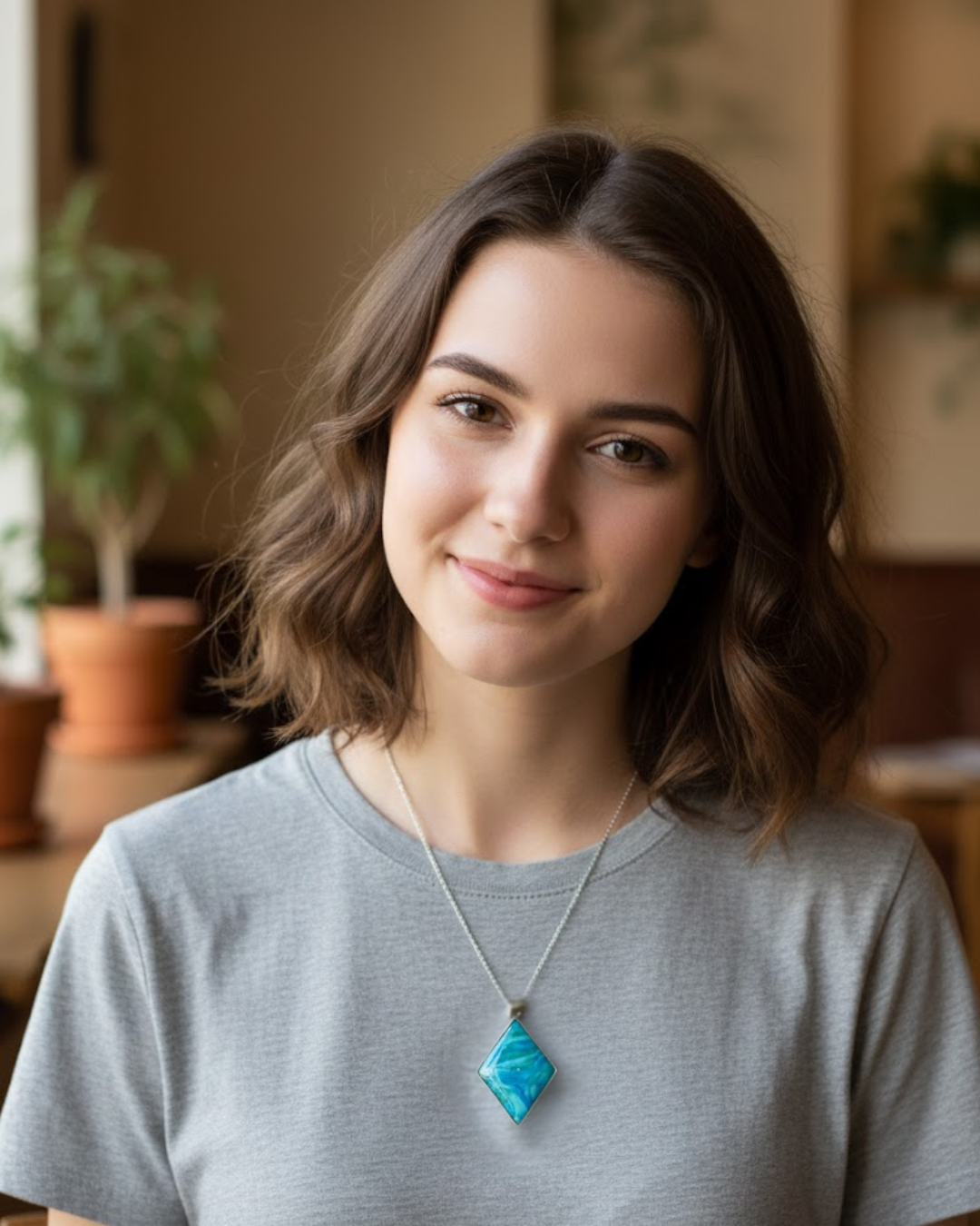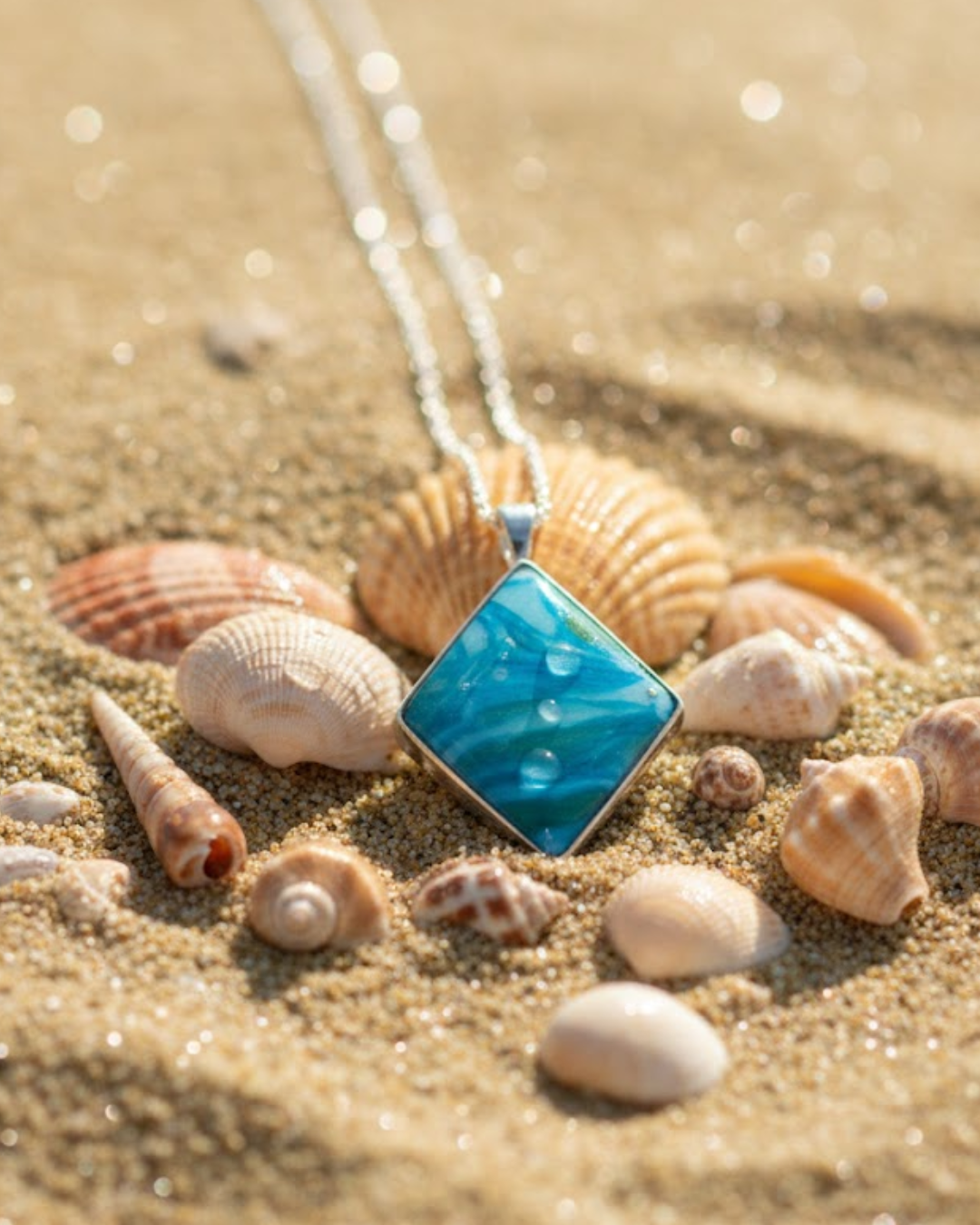 Całość została pokryta krystaliczną żywicą epoksydową, która tworzy błyszczącą, twardą taflę. Dzięki niej kolory zyskują trójwymiarowość, a wisior do złudzenia przypomina prawdziwy kamień oszlifowany przez naturę.