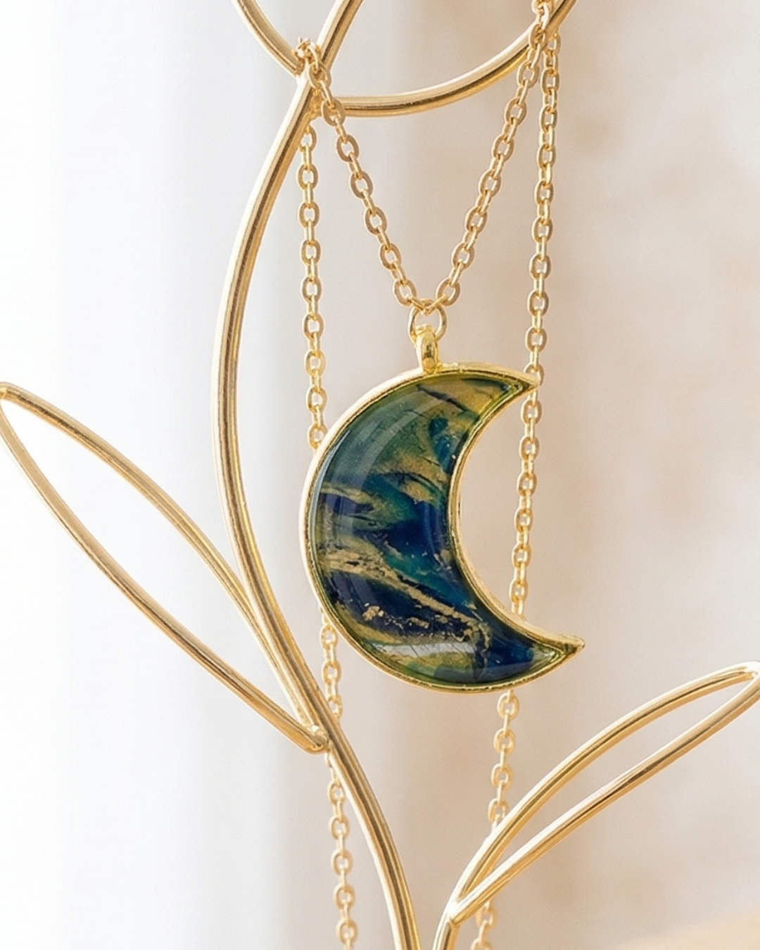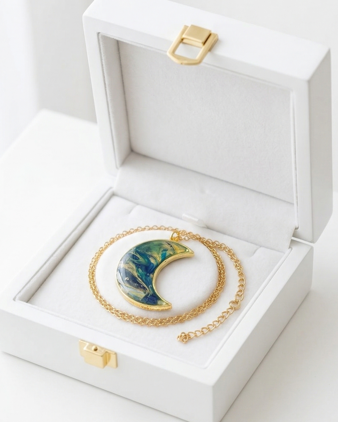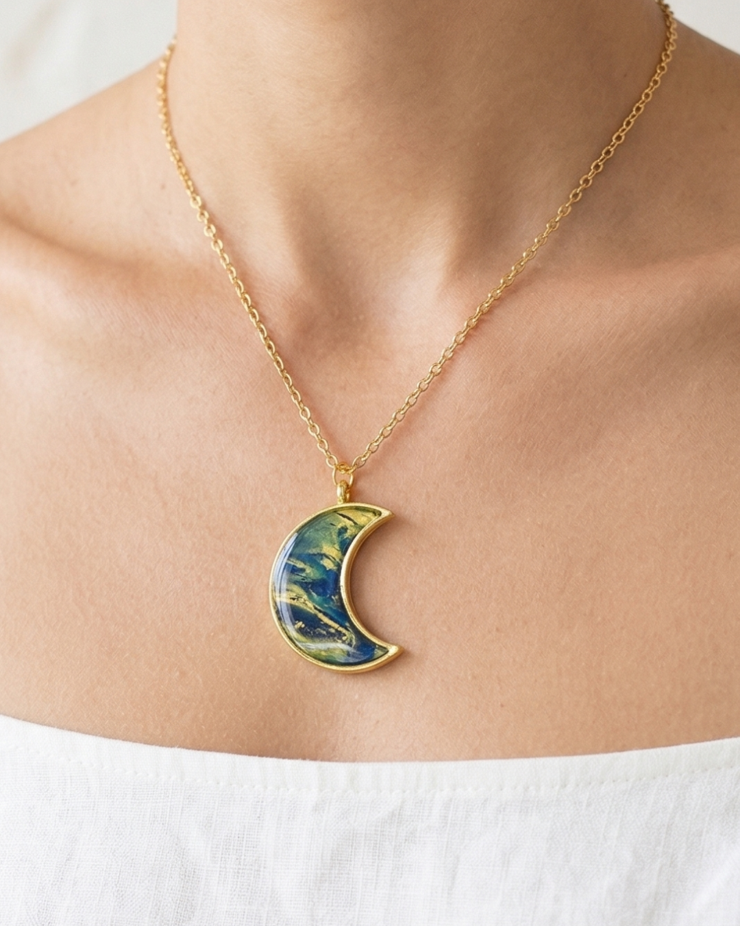 Sercem naszyjnika jest wisior w kształcie księżyca, wykonany ręcznie z wysokiej jakości glinki polimerowej. Jego powierzchnię pokrywa kunsztownie wylana żywica epoksydowa, która tworzy efekt niesamowitej trójwymiarowej głębi. Dzięki niej kolory przenikają się w fascynujący sposób, a całość zyskuje lustrzany połysk i luksusową elegancję.