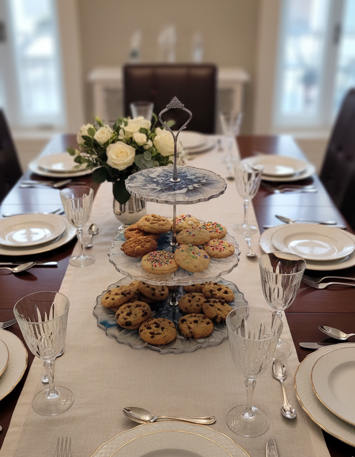 Przedstawiamy Państwu wyjątkową paterę, która jest czymś więcej niż tylko naczyniem – to małe dzieło sztuki użytkowej, stworzone z pasji do designu i precyzji wykonania. Każdy poziom patery został ręcznie wylany z najwyższej jakości żywicy epoksydowej, tworząc niepowtarzalne, organiczne wzory przypominające krystaliczną wodę oceanu mieszającą się z mroźną bielą.