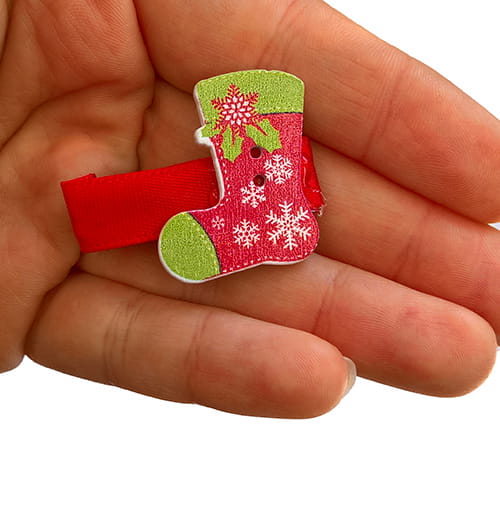 Urocza świąteczna spineczka z drewnianą skarpetą.