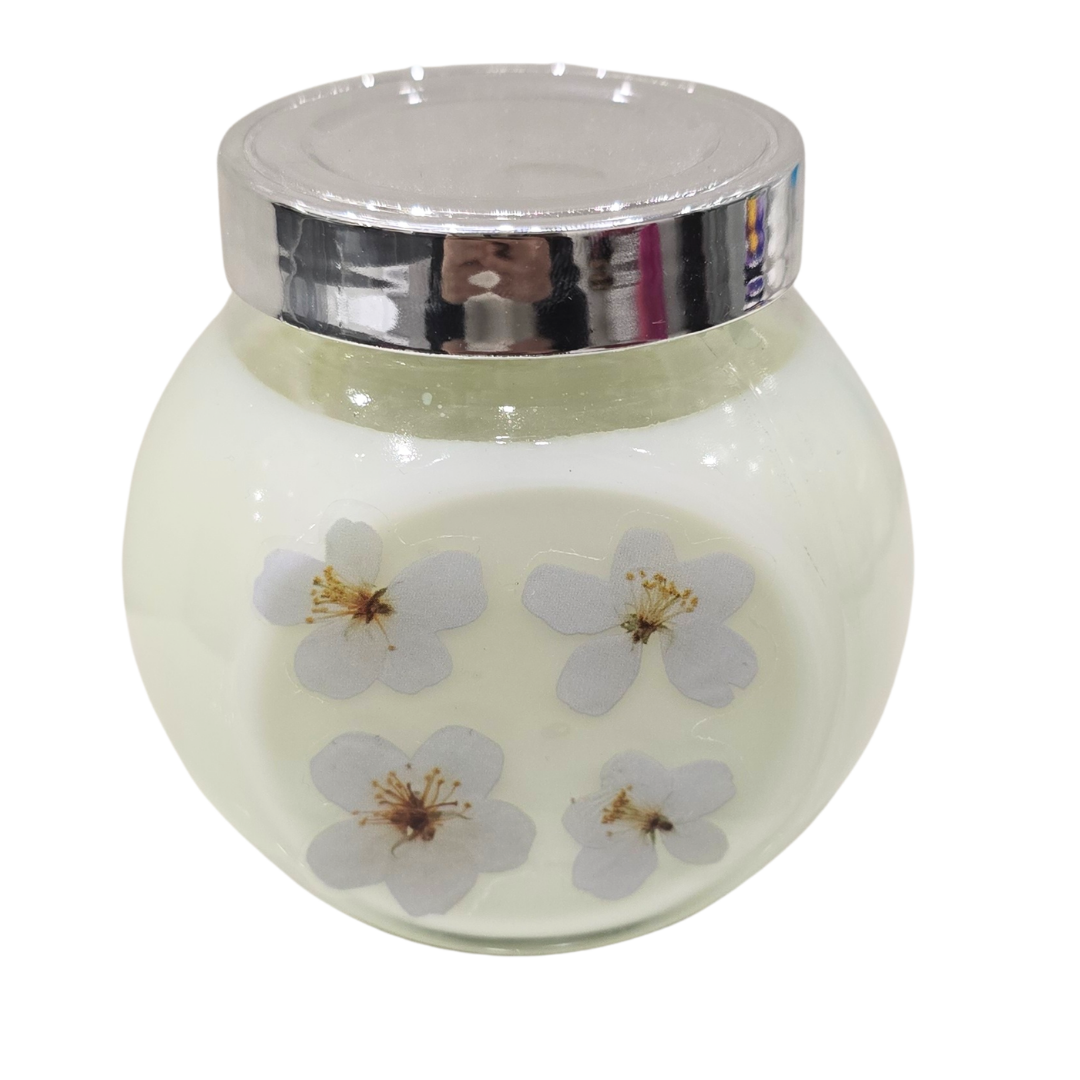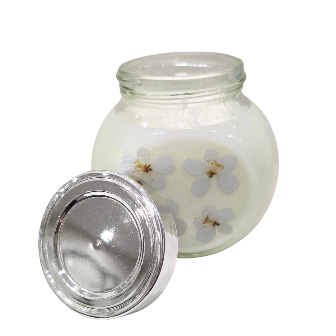 Naturalne Kwiaty: W wosku zatopione są delikatne, prasowane białe kwiaty, które nadają świecy romantyczny, wiosenny charakter. Płomień podświetla ich strukturę, tworząc wyjątkowy efekt wizualny.