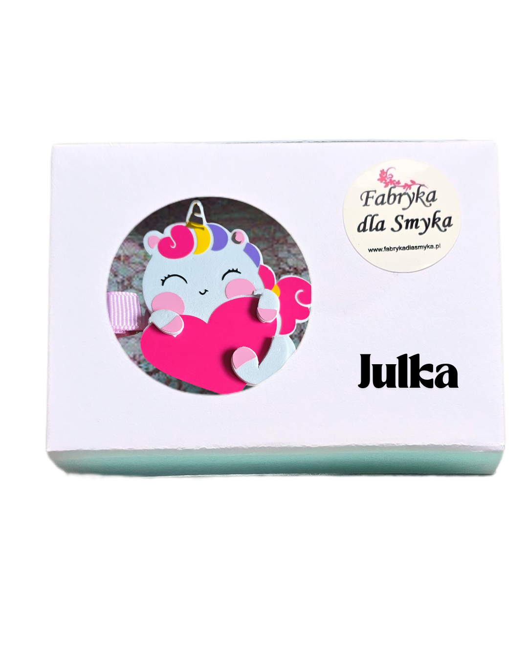 Wyjątkowa, ręcznie robiona spinka z uroczym jednorożcem tulącym serce!