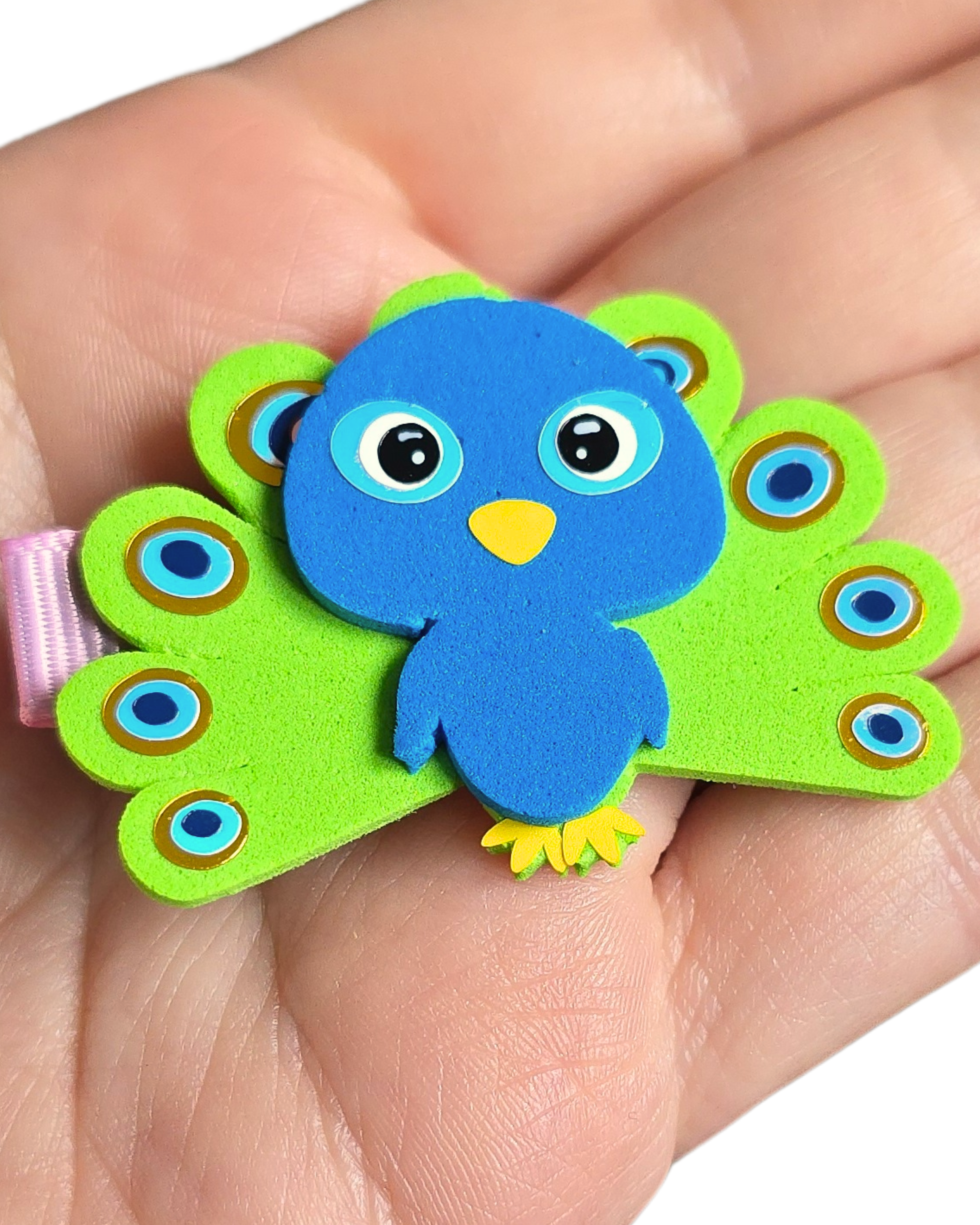 Przedstawiamy uroczą, ręcznie robioną spinkę do włosów, która przeniesie Twoją pociechę w magiczny świat barw i fantazji! Ta wyjątkowa spinka w kształcie pawia, z misternie wykonanymi detalami i żywymi kolorami, to prawdziwe małe dzieło sztuki, które doda blasku każdej dziecięcej stylizacji.