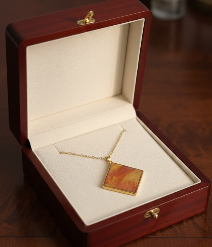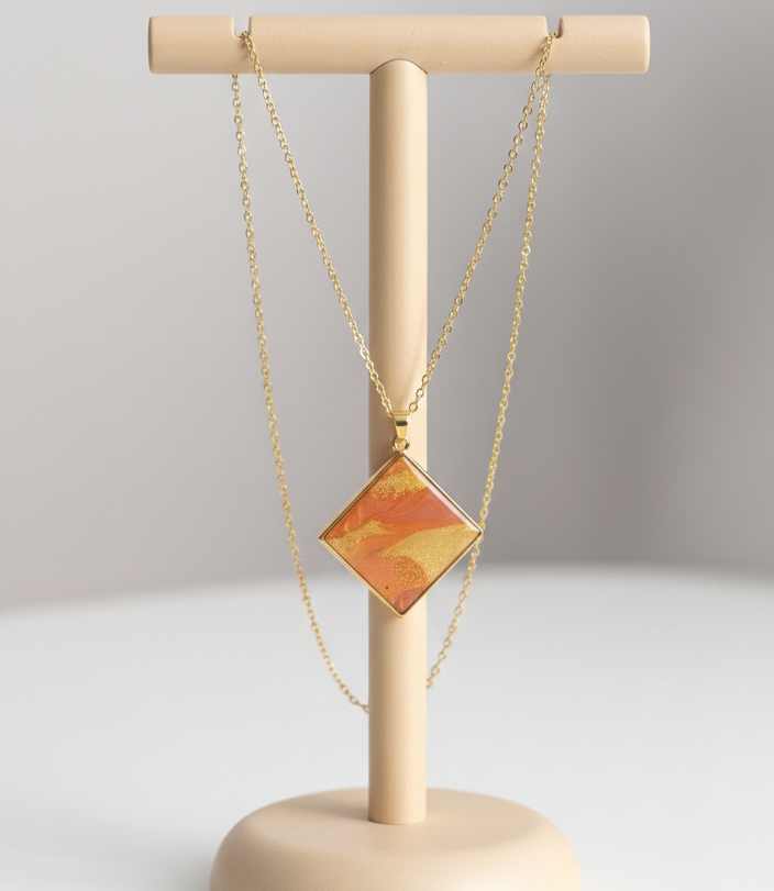 Głębia i blask: Powierzchnia została zabezpieczona krystaliczną żywicą epoksydową. Nadaje ona biżuterii piękny, lustrzany połysk, chroni kolory przed płowieniem i dodaje niesamowitej głębi trójwymiarowemu wzorowi.