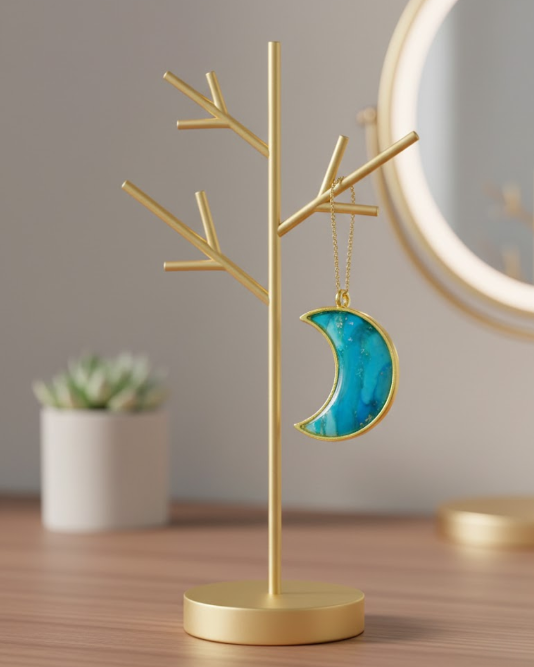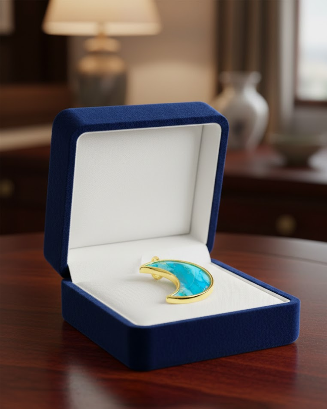 Złota oprawa: Oprawa w kolorze złota nadaje biżuterii klasycznego szyku i pięknie kontrastuje z chłodnymi odcieniami błękitu.